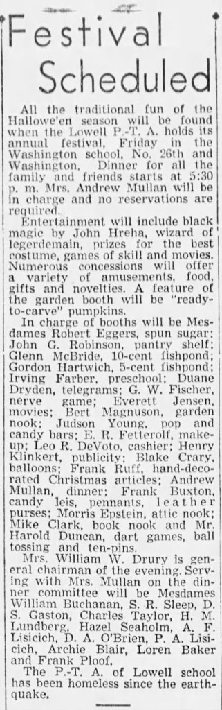 The Lowell PTA schedules a Hallowe’en festival at Washington school. Activities and entertainment will include dinner, black magic, costume contests, games, movies, concessions, and pumpkin carving.