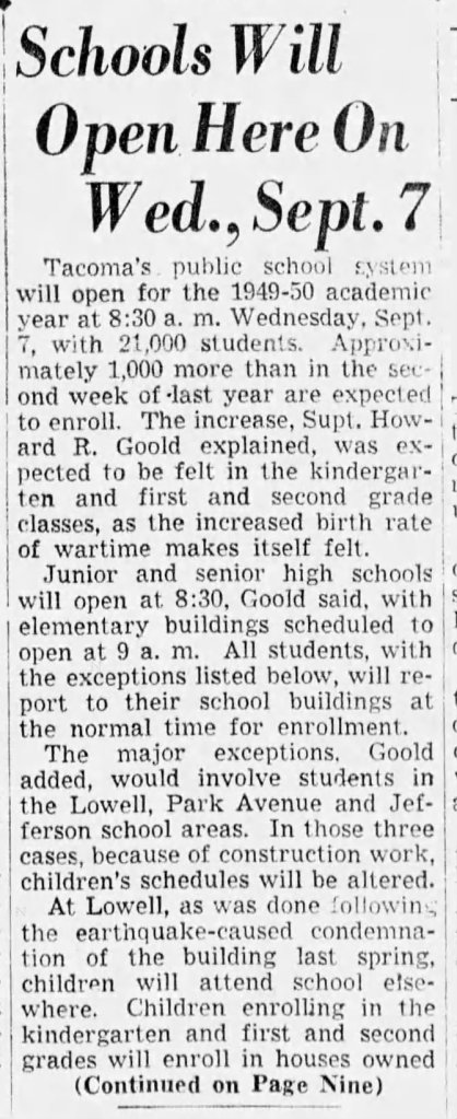 Caption: The Future, The Present, The Past – About all that remained of the old Lowell school on No. Yakima Ave. this week, except for memories and a pile of rubble, was the stone archway of the main entrance. The three children who stand under the arch in a scene distinctly remindful of the earthquake which made the building unfit for use are, left to right, Kathryn Robinson, 3, who won’t be ready for school before the new building is completed next year; her brother, Peter, 9, who will be one of many to be transported to other classrooms during the coming year, and Mike Clark, 13, of 922 No. Stadium way, who’s an “old grad” of Lowell – he’ll be in the ninth grade at Mason junior high school next week. – Copyright photo by Richards studio.