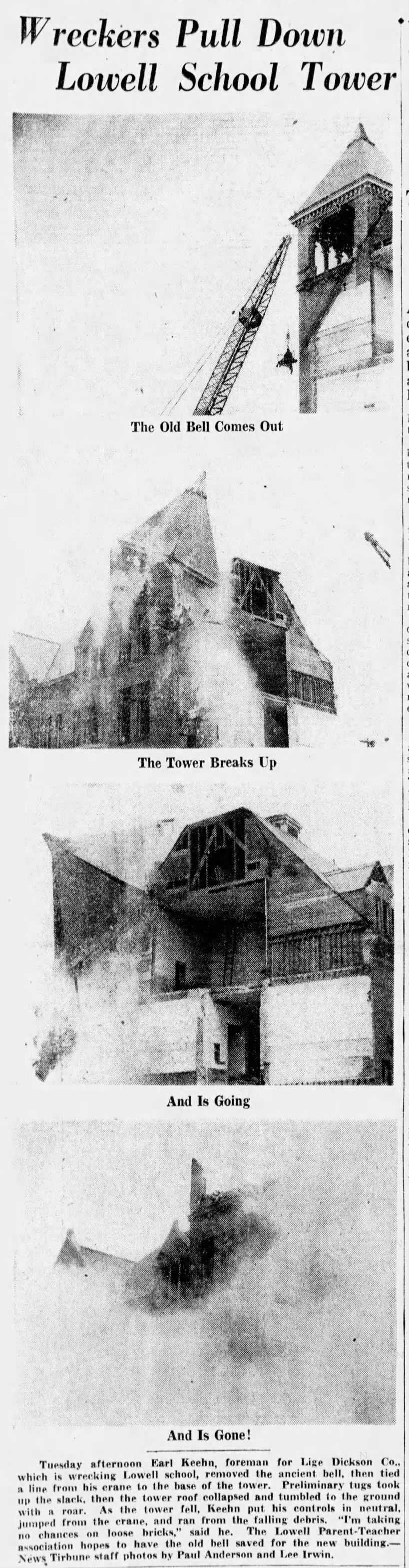 Caption: Tuesday afternoon Earl Keehn, foreman for Lige Dickson Co., which is wrecking Lowell school, removed the ancient bell, then tied a line from his crane to the base of the tower. Preliminary tugs took up the slack, then the tower roof collapsed and tumbled to the ground with a roar. As the tower fell, Keehn put his controls in neutral, jumped from the crane, and ran from the falling debris. “I’m taking no chances on loose bricks,” said he. The Lowell Parent-Teacher association hopes to have the old bell saved for the new building. – News Tribune staff photos by Paul Anderson and Lee Irwin.