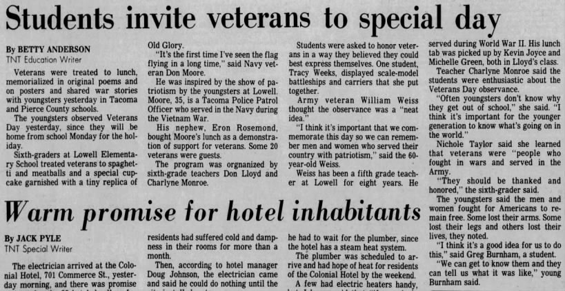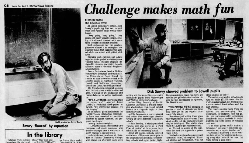 Professor Dick Sawry, who teaches at the University of Puget Sound, spends an hour each week with students at various Tacoma elementary schools as part of a program. Students learn about a variety of topics from Professor Sawry, as well as other instructors who also participate in the program.