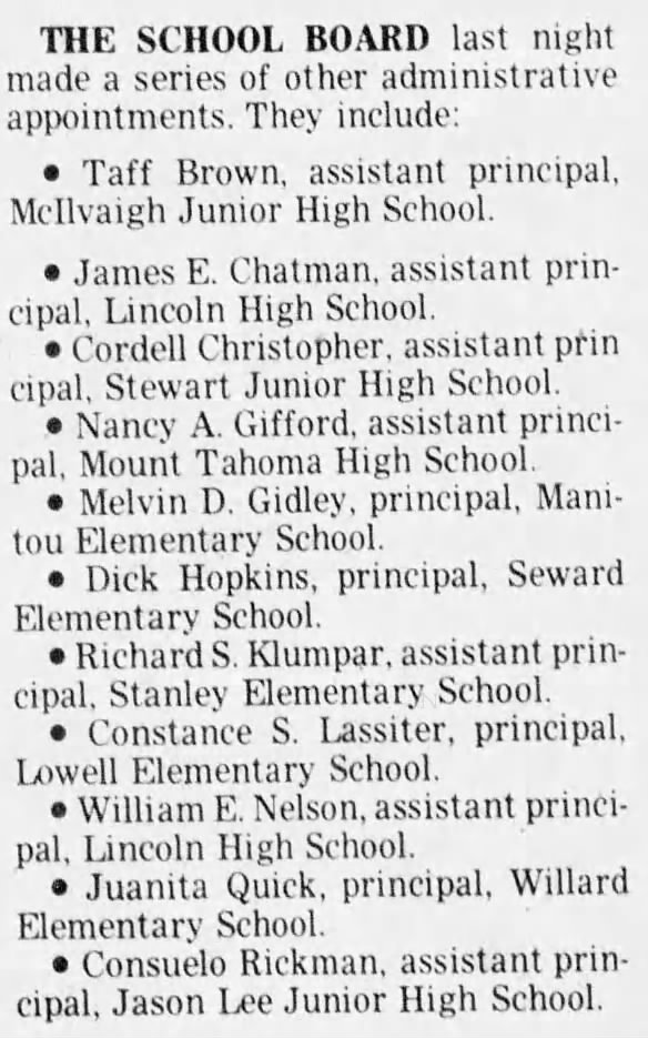 Constance S. Lassister is announced as the new principal of Lowell beginning in the 1978-79 school year.