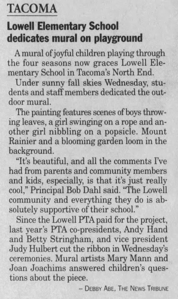 Since the Lowell PTA paid for the project, last year’s PTA co-presidents, Andy Hand and Betty Stringham, and vice president Judy Hulbert cut the ribbon in Wednesday’s ceremonies. Mural artists Mary Mann and Joan Joachims answered children’s questions about the piece.