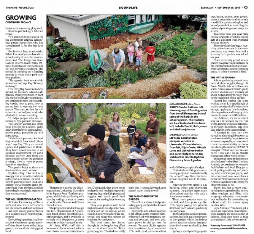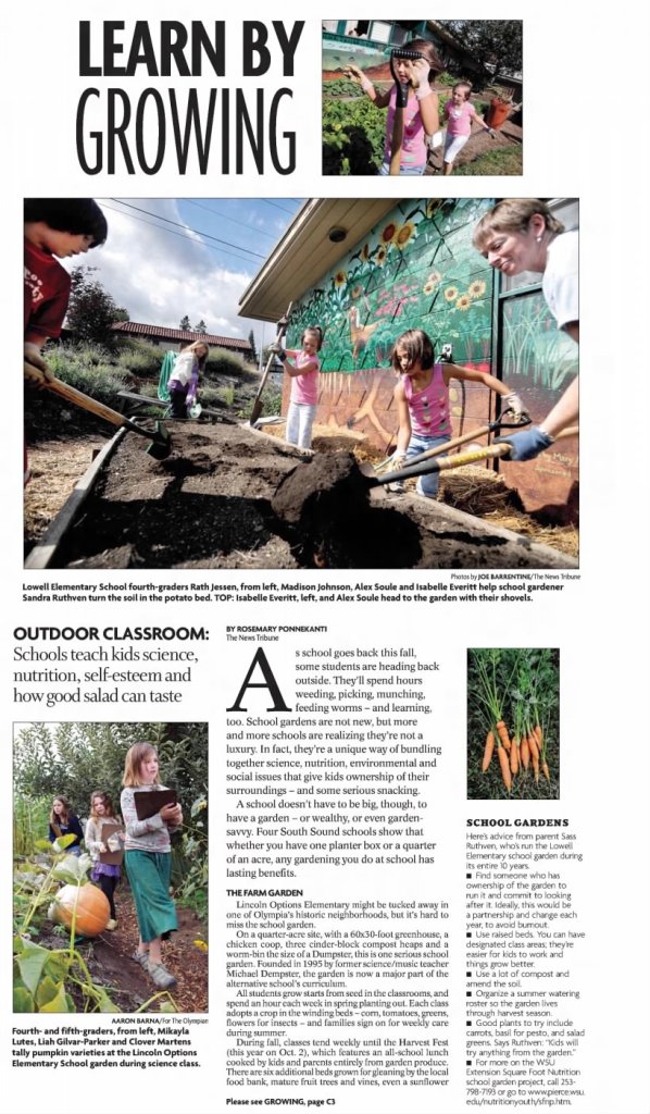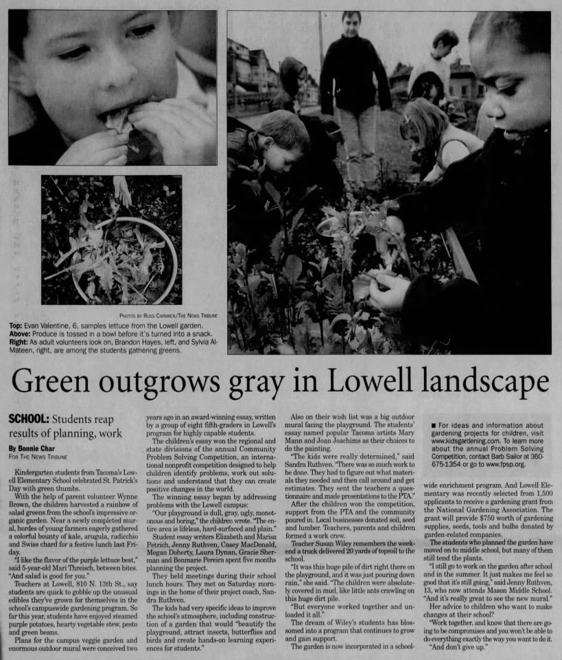 The garden is now incorporated in a school-wide enrichment program. And Lowell Elementary was recently selected from 1,500 applicants to receive a gardening grant from the National Gardening Association. The grant will provide $750 worth of gardening supplies, seeds, tools and bulbs donated by garden-related companies.