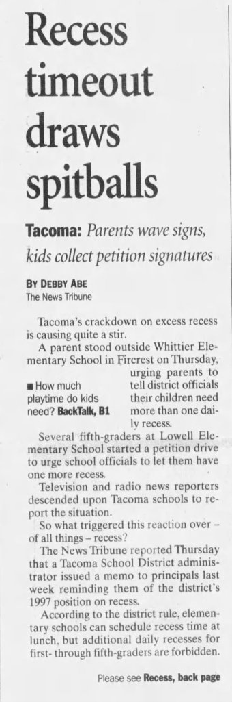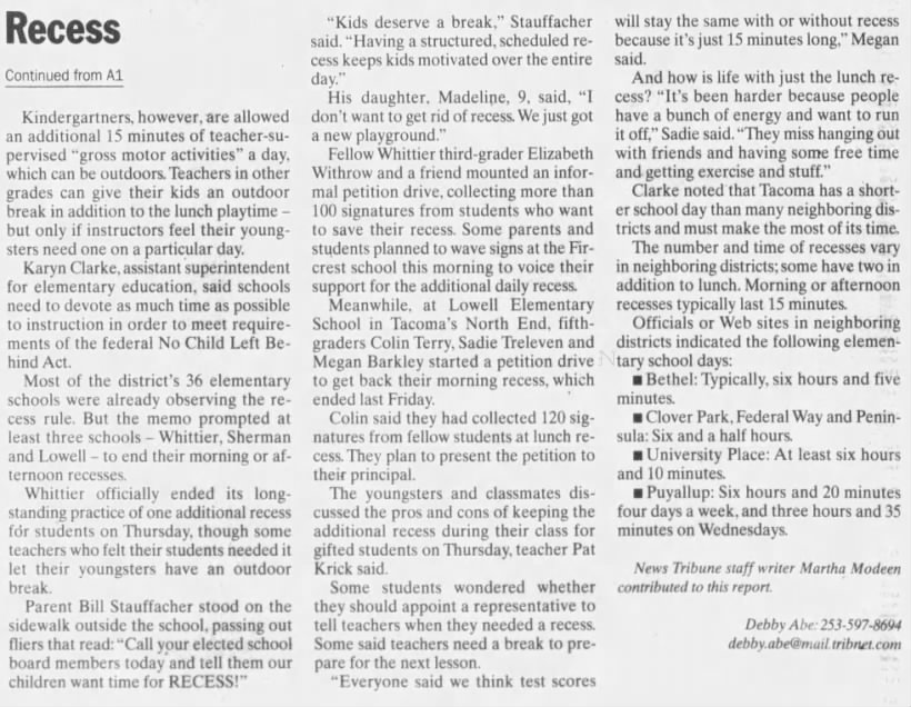 Meanwhile, at Lowell Elementary School in Tacoma’s North End, fifth-graders Colin Terry, Sadie Treleven and Megan Barkley started a petition drive to get back their morning recess, which ended last Friday.
