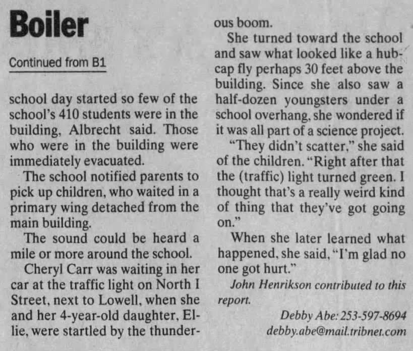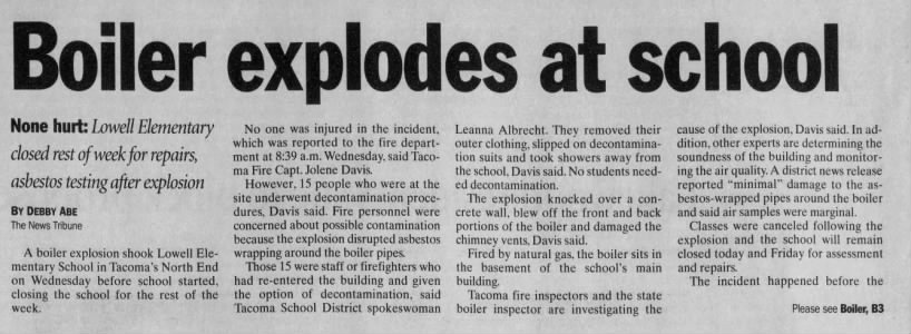 Tacoma fire inspectors and the state boiler inspector are investigating the cause of the explosion, Davis said. In addition, other experts are determining the soundness of the building and monitoring the air quality. A district news release reported “minimal” damage to the asbestos-wrapped pipes around the boiler and said air samples were marginal.