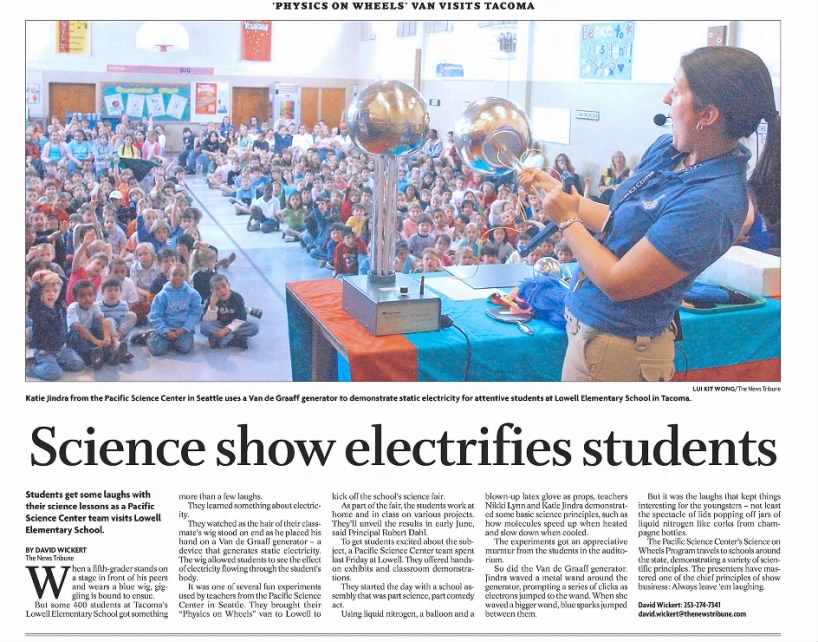 Photo caption: Katie Jindra from the Pacific Science Center in seattle uses a Van de Graaff generator to demonstrate static electricity for attentive students at Lowell Elementary School in Tacoma.