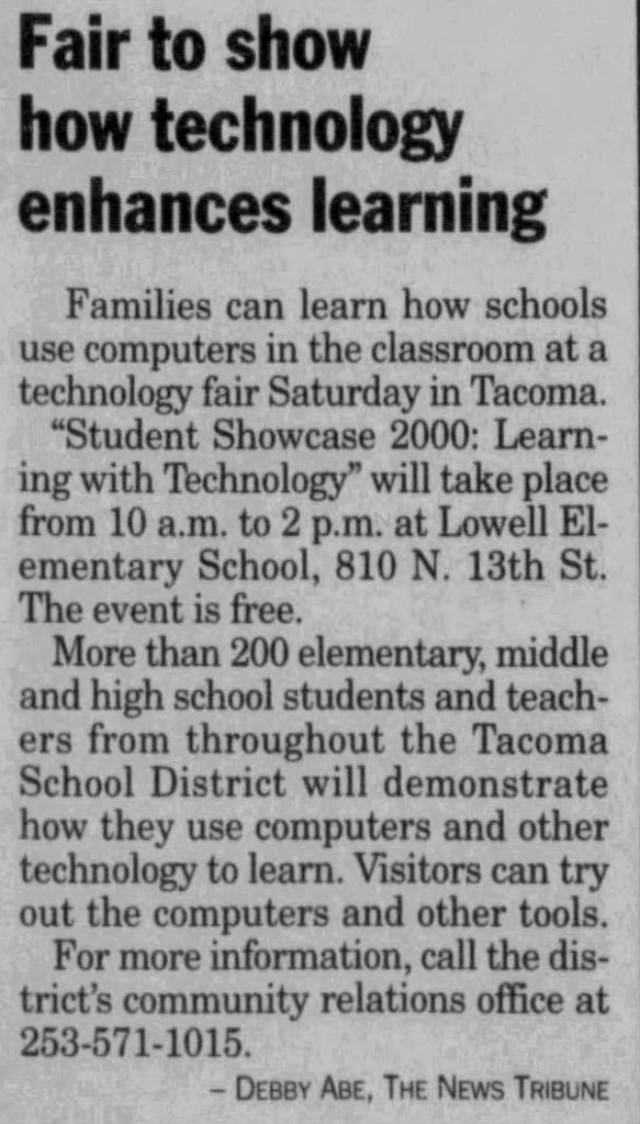 More than 200 elementary, middle and high school students and teachers from throughout the Tacoma School District will demonstrate how they use computers and other technology to learn. Visitors can try out the computers and other tools.