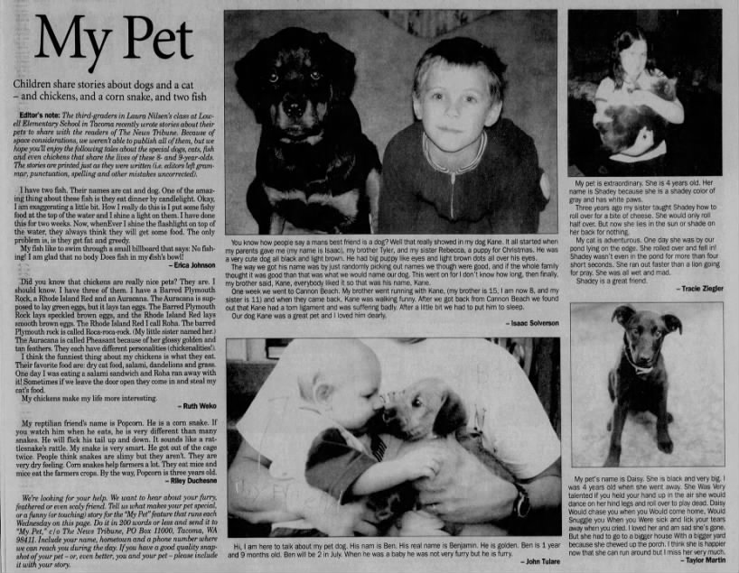 Editor’s note: The third-graders in Laura Nilsen’s class at Lowell Elementary School in Tacoma recently wrote stories about their pets to share with the readers of The News Tribune. Because of space considerations, we weren’t able to publish all of them, but we hope you’ll enjoy the following tales about the special dogs, cats, fish and even chickens that share the lives of these 8- and 9-year olds. The stories are printed just as they were written (i.e. editors left grammar, punctuation, spelling and other mistakes uncorrected).
